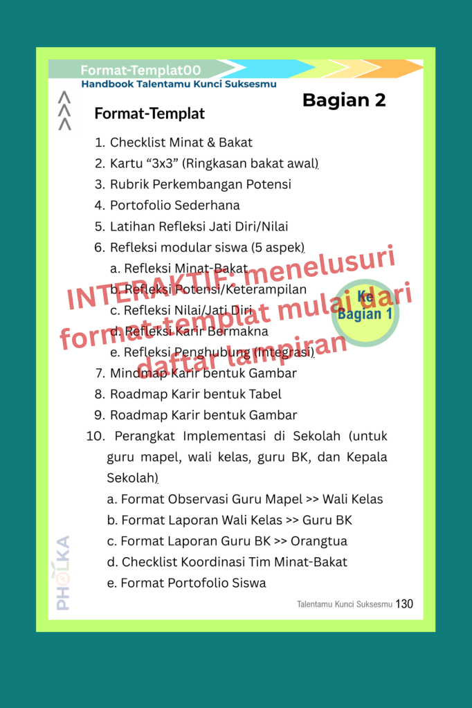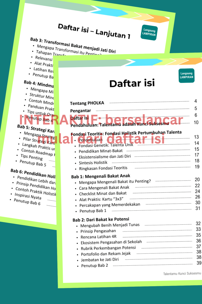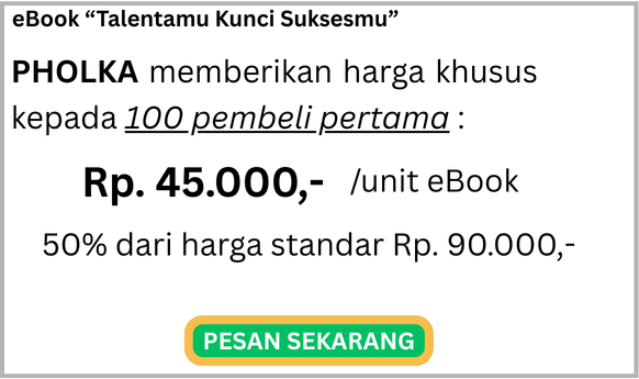 Melalui handbook “TALENTAMU KUNCI SUKSESMU”, PHOLKA ingin mengajak pendidik dan orangtua untuk bersinergi melakukan langkah-langkah mudah, konkret, dan realistis, untuk mendampingi anak tumbuh alamiah dengan jati dirinya dalam perjalanan meniti karir yang bermakna: mencapai sukses materiil, bahagia, dan bermanfaat bagi sesama.