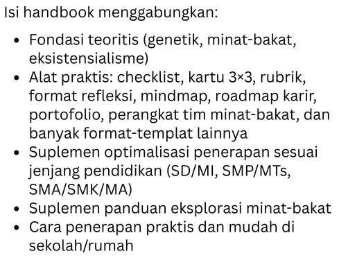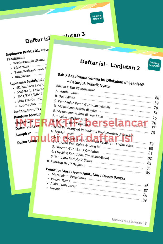 “Talentamu Kunci Suksesmu” adalah handbook praktis yang mudah diterapkan, membawa visi sederhana tapi mendalam: mengembalikan pendidikan ke fitrahnya dalam spirit ajaran Ki Hajar Dewantara: Mendampingi anak tumbuh utuh.