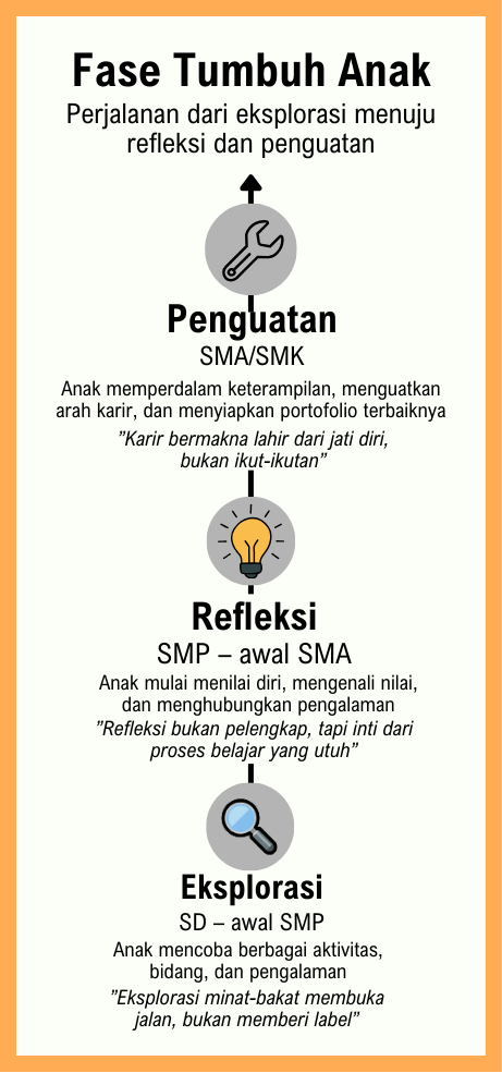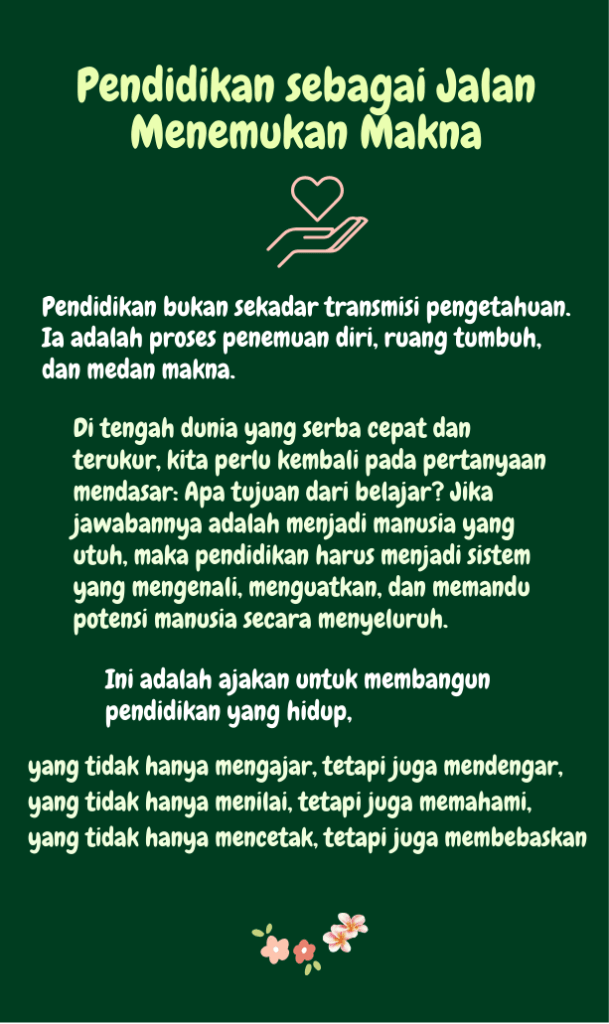 Pendidikan ideal bukan hanya mengajar, tetapi menuntun anak pulang ke dirinya: mengenali bakat, menumbuhkan jati diri, dan mengekspresikannya dalam karir yang bermakna.